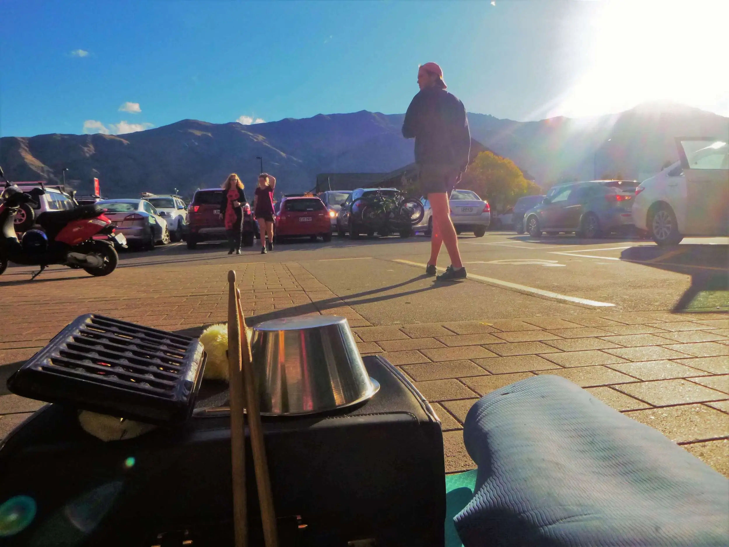 Pāriet divpadsmit gadus uz priekšu līdz manai nākamajai darba pieredzei. Es sēdēju uz zemes iepretim pārtikas veikalam Jaunzēlandes hipiju pilsētiņā un bungoju pie sava smalki atlasītā katlu, pannu un burciņu klāsta (kā arī vēsas metāla restes, ko atradu). Blakus man stāvēja japāņu hipijs, kurš džemdēja pie ģitāras, dejoja un dziedāja ar milzīgu smaidu.